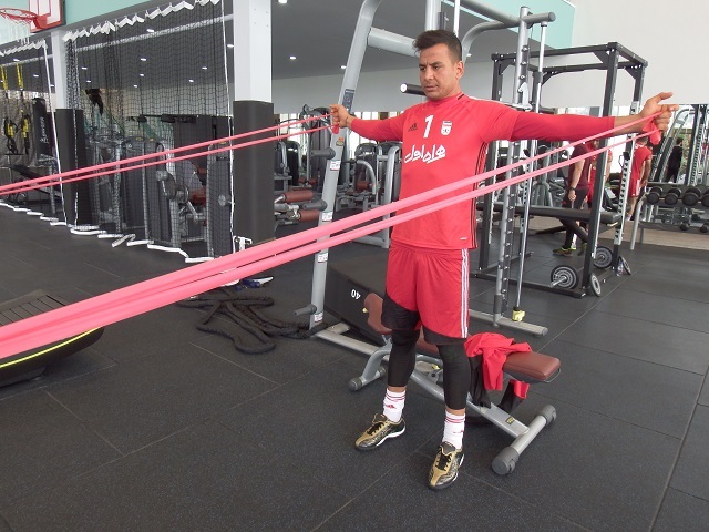 پیش از آغاز تمرین مانند هر روز، کادر تیم ملی ادوات و تجهیزات مورد نظر تمرین را در سالن جیم پک سازماندهی کردند.