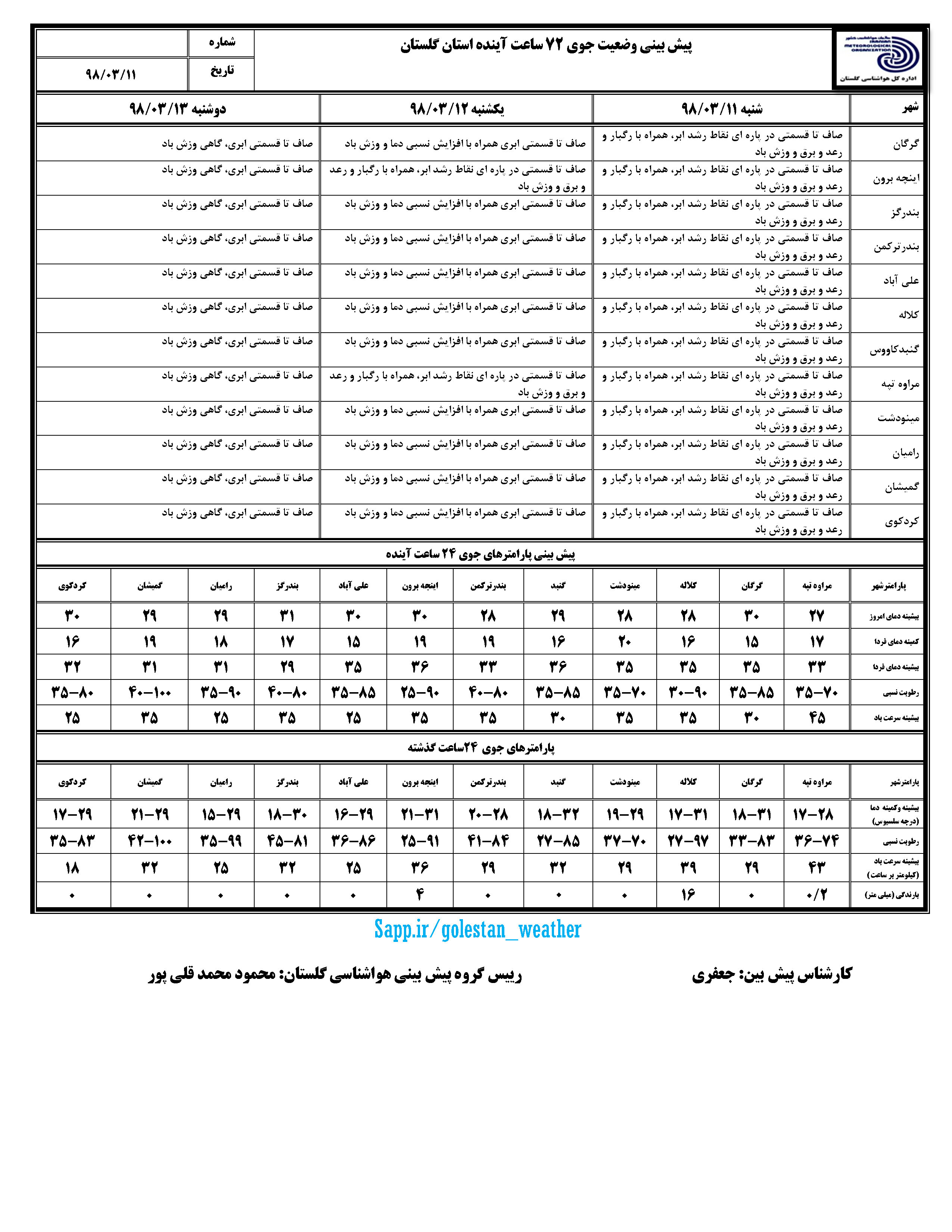 وی ادامه داد: امروز در ساعات بعدازظهر و اوایل شب احتمال افزایش ابر موقت، رگبار پراکنده و رعد و برق در این مناطق وجود دارد.