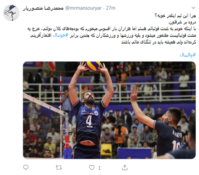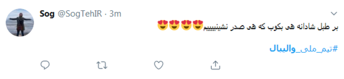 کاربران فضای مجازی پیروزی تیم ملی والیبال ایران بر لهستان و صدرنشینی در لیگ جهانی را تبریک گفتند و از آن ابراز خوشحالی کردند.