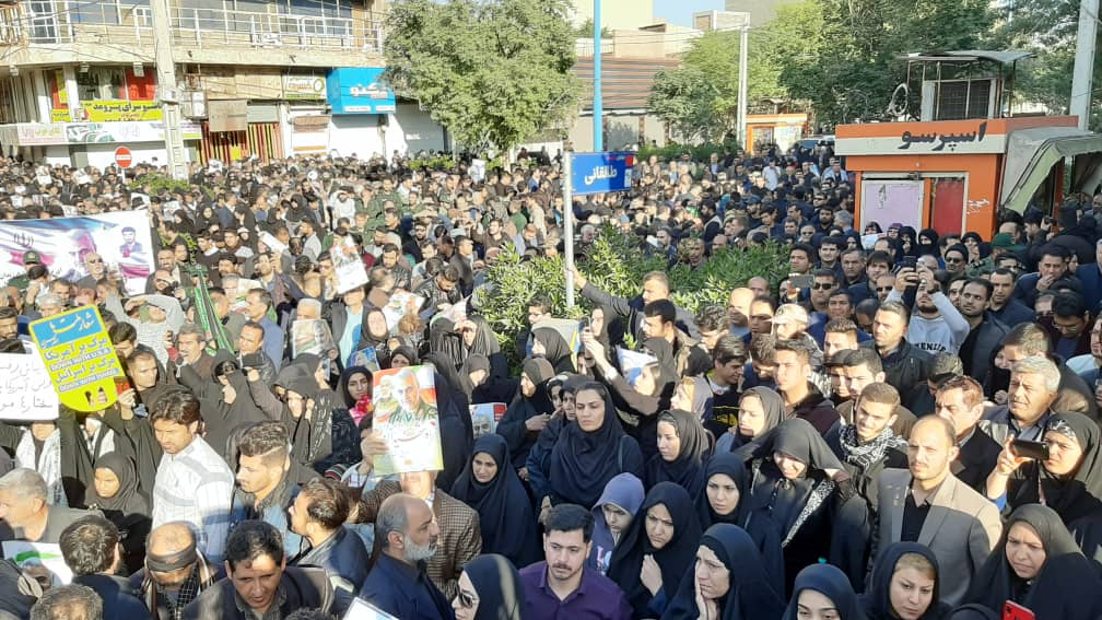 مردم عاشورایی خوزستان در مراسم تشییع باشکوه سردار پرافتخار اسلام و ایران و همرزمان شهید دلاورش فریاد انتقامخواهی سردادند و شعار مرگ بر آمریکا و مرگ بر اسرائیل را به گوش جهانیان رساندند.