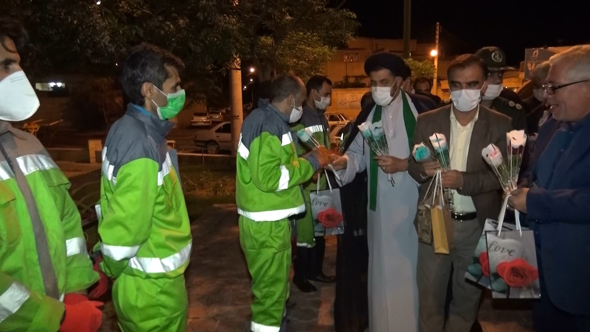 جمعی از مسئولان کاشان شبانه از فعالیت های کارگران این شهر بازدید و با اهدای گل از زحمات آنان قدردانی کردند.