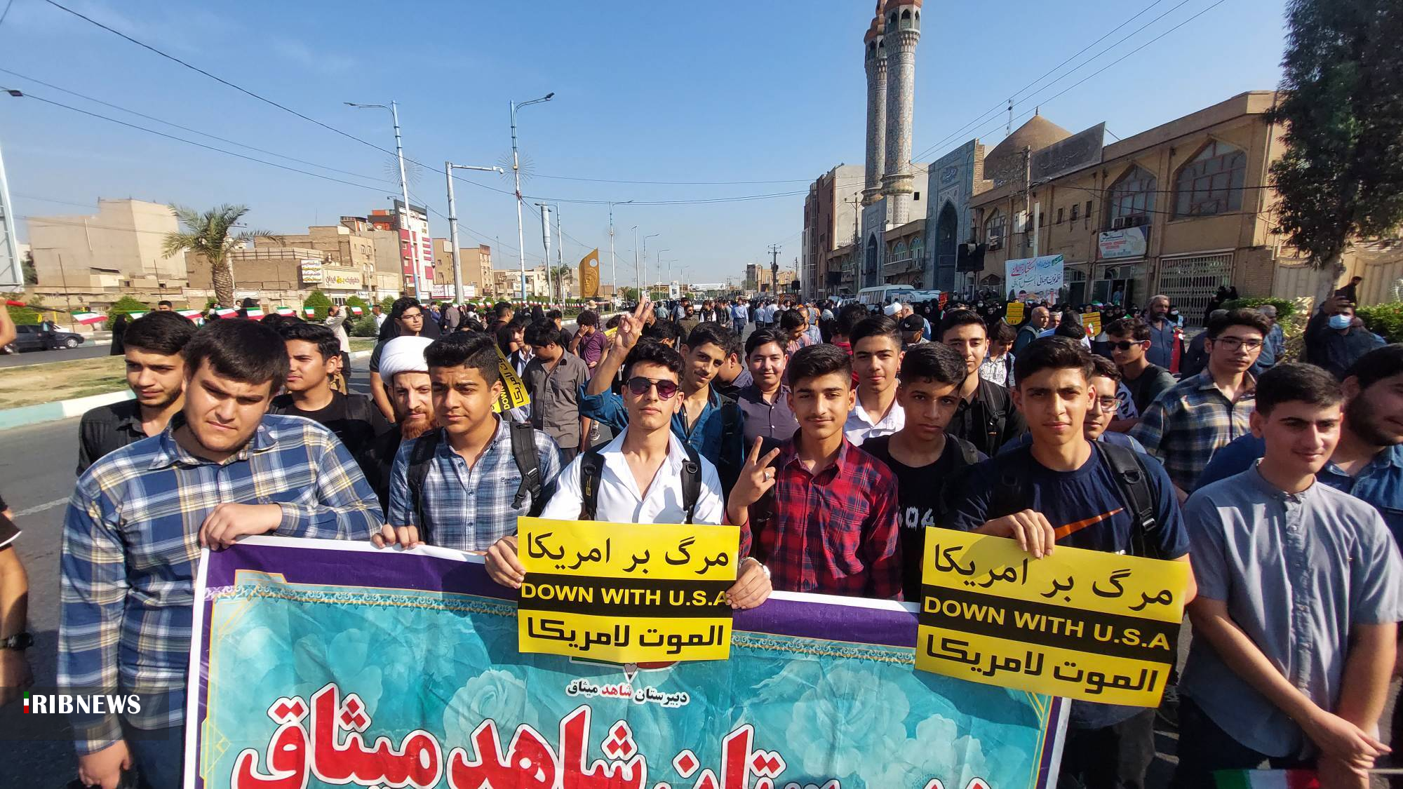 جمعی از دانشآموزان در این راهپیمایی پلاکاردهایی با مضامین مرگ بر اسراییل، مرگ بر آمریکا، ۱۳ آبان، یوم الله و جانم فدای رهبر در دست داشتند.