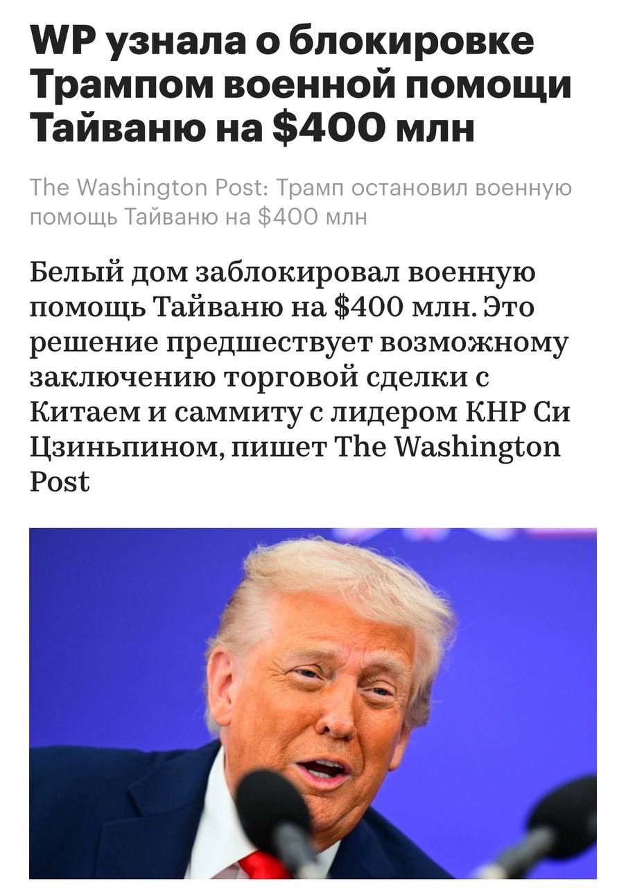 ⁃ واشنگتنپست: ترامپ کمک نظامی ۴۰۰ میلیون دلاری به تایوان را مسدود کرد